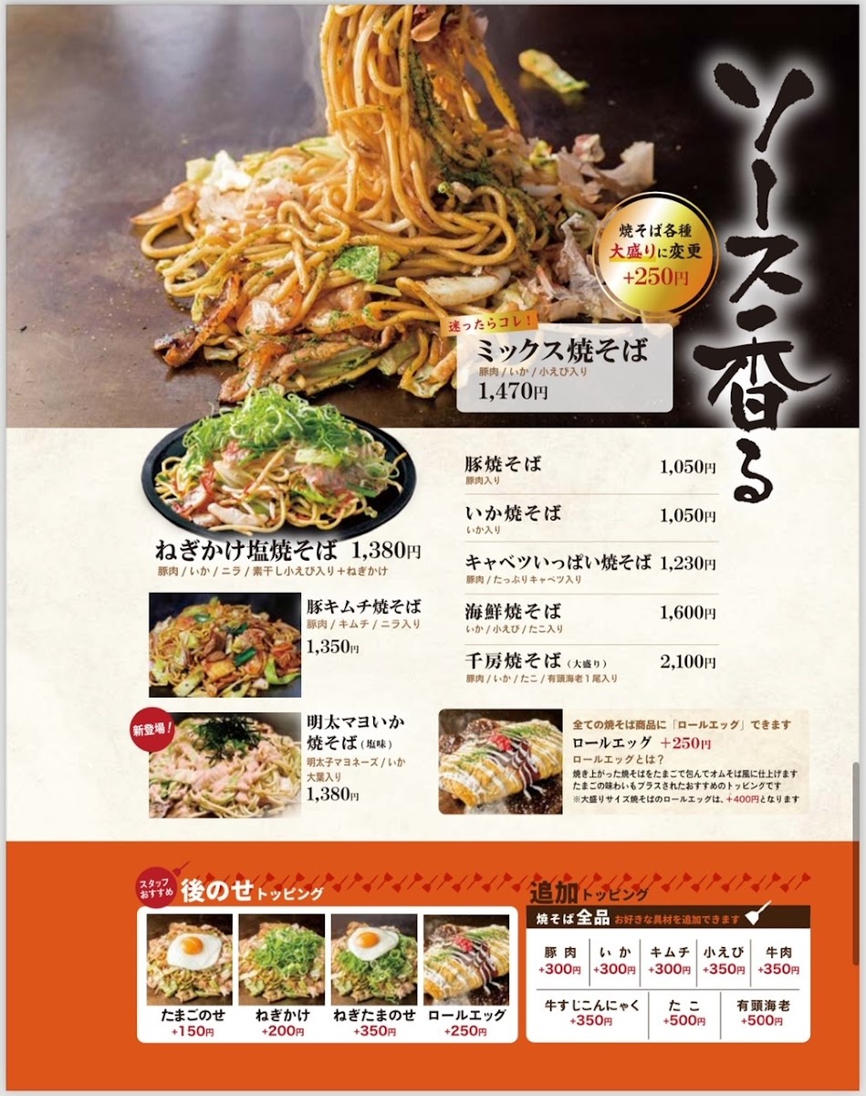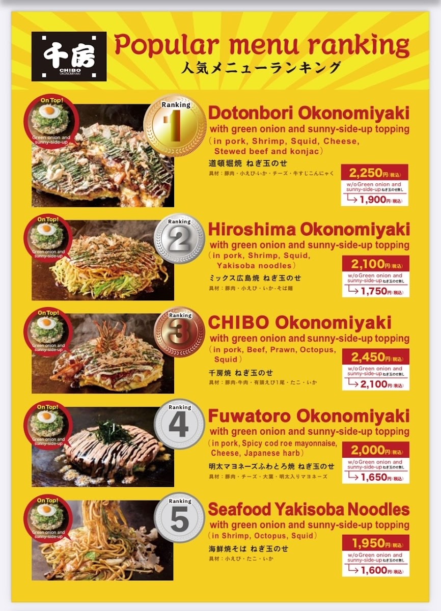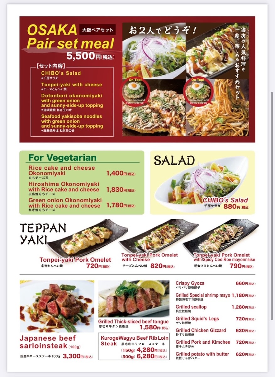 The menu at Chibo Sonezakishiten offers a straightforward and inviting selection centered around traditional okonomiyaki and teppanyaki dishes. Guests can expect casual bites that bring a comforting and hearty feel, perfect for sharing in a lively yet relaxed setting. Whether stopping by for a satisfying lunch or an informal dinner, the food’s approachable flavors match the welcoming atmosphere of this Osaka neighborhood spot.