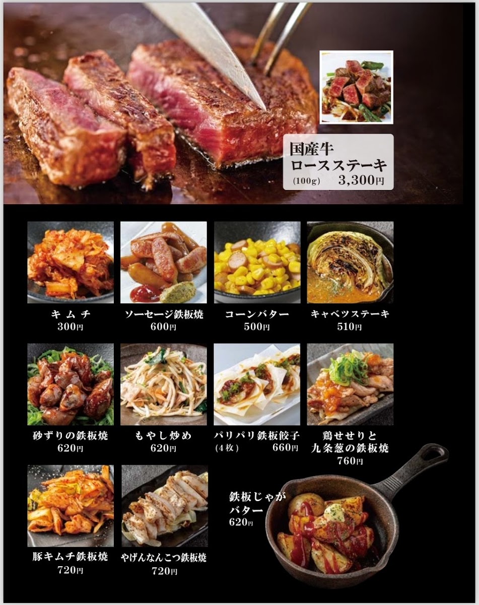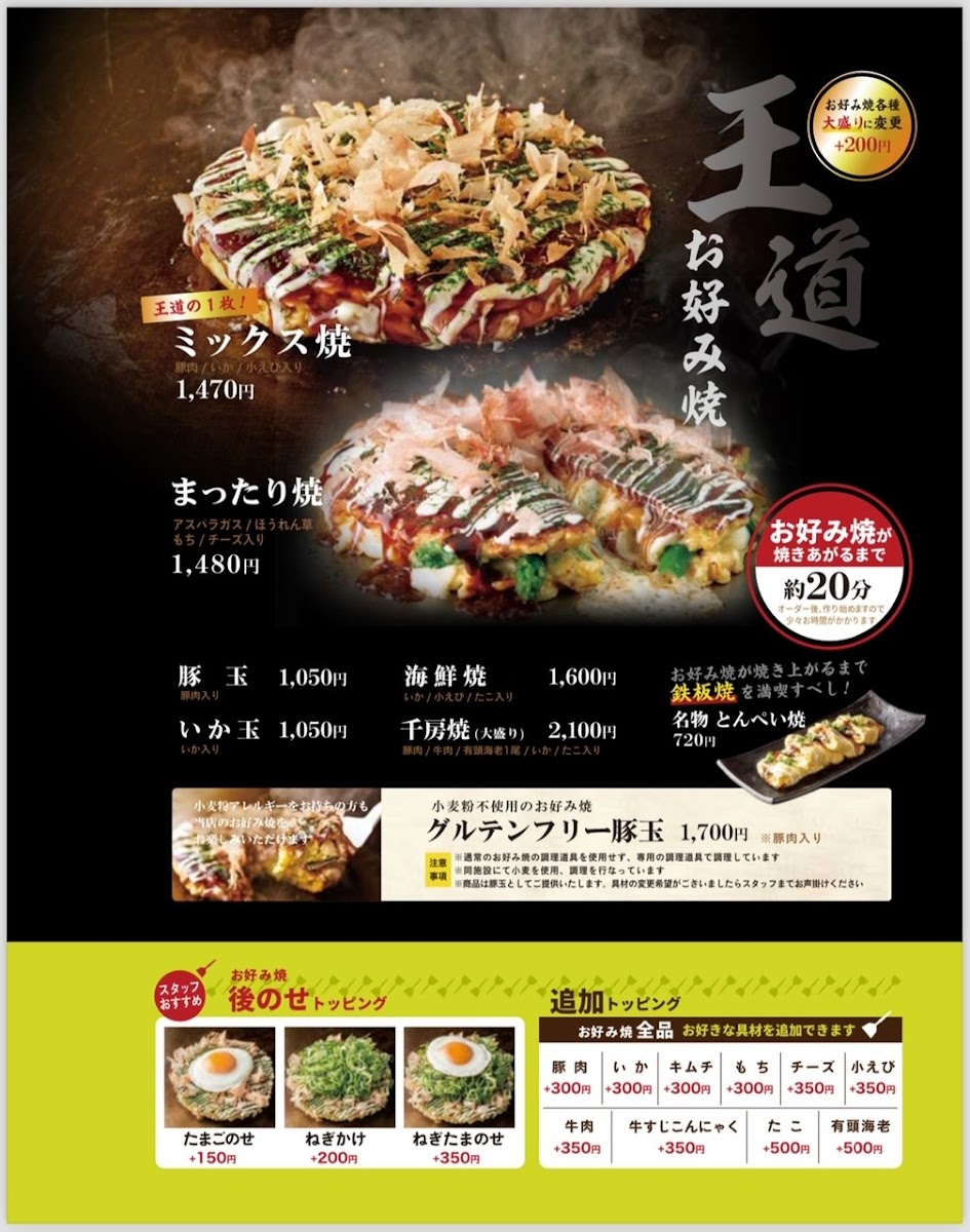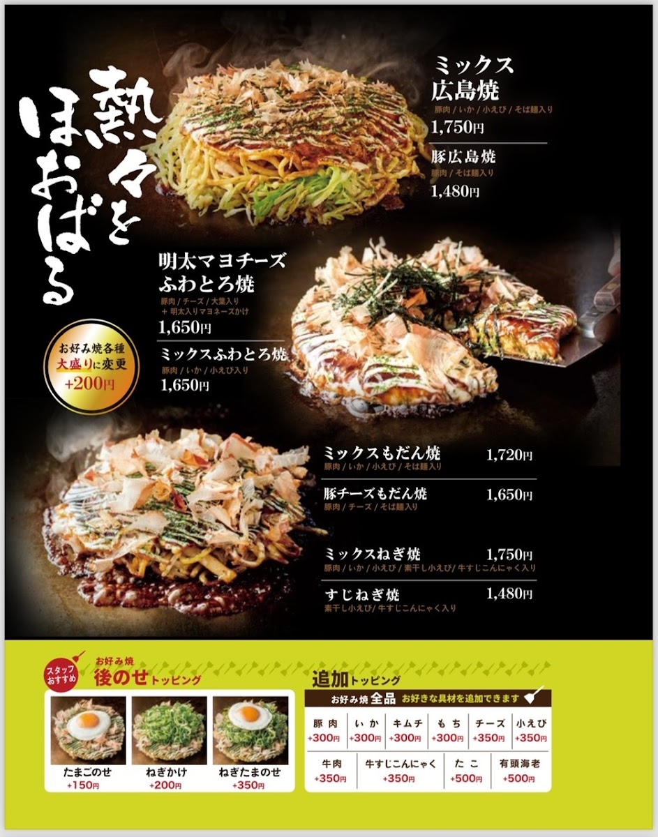 Highlights include classic okonomiyaki options like the ぶた玉 (pork okonomiyaki), alongside grilled specialties such as gyoza and sizzling buttered scallops. The menu also features seasonal vegetable dishes, including asparagus with melted cheese, and a variety of teppan-grilled items like tender ribeye steak and savory grilled squid.